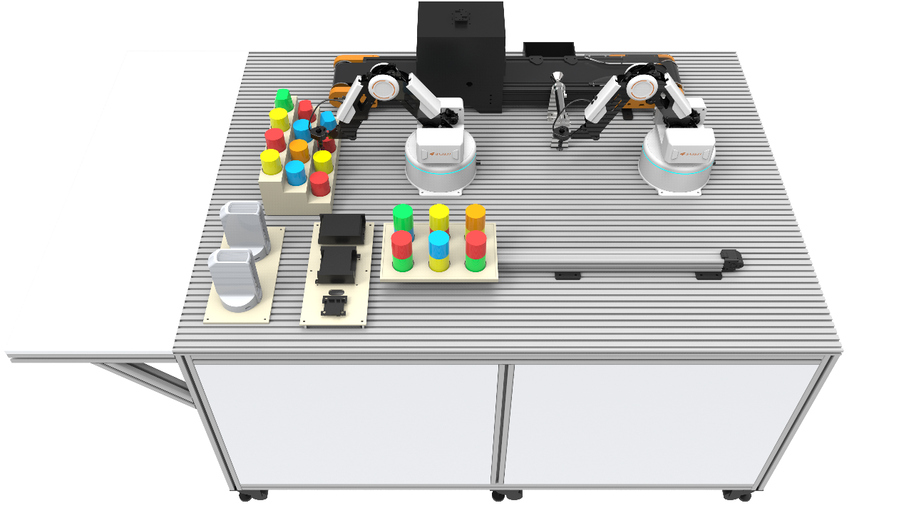 智能货物码垛系统通过四轴码垛机械臂,传送带,滑动台组成一套码垛系统,可以将流水线上的货物堆积起来方便运输;第一个机械臂从仓库取出货物并放到传送带上,视觉模块检测货物的质量,剔除有缺陷的货物;第二个机械臂将传送带上的货物堆放到托盘上。